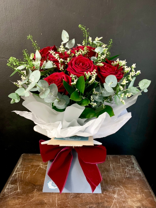 The red rose represents love, devotion, commitment and is the symbol of the human heart and divine love. Our luxury 12 red rose gift bouquet includes sweet smelling Naomi roses mixed with delicate white flowers such as limonium, wax flower or astrantia surrounded by foliage thlaspi and eucalyptus.