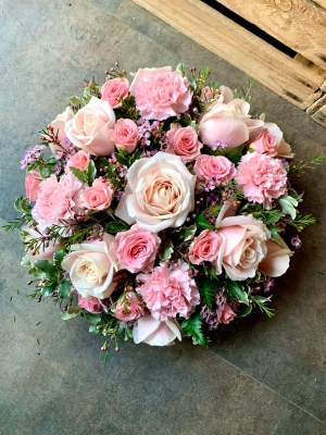 Pale pink posy arranged using large avalanche roses, spray roses and carnations.