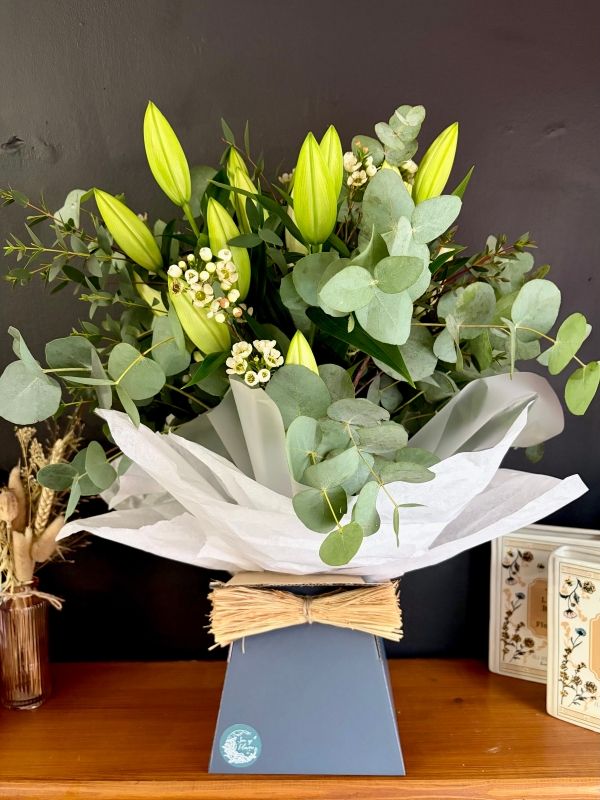 A traditional long lasting White Lily and eucalyptus gift bouquet featuring pretty wax flower. Presented within our signature gift box with stems wrapped in a water bubble to keep flowers fresher for longer.